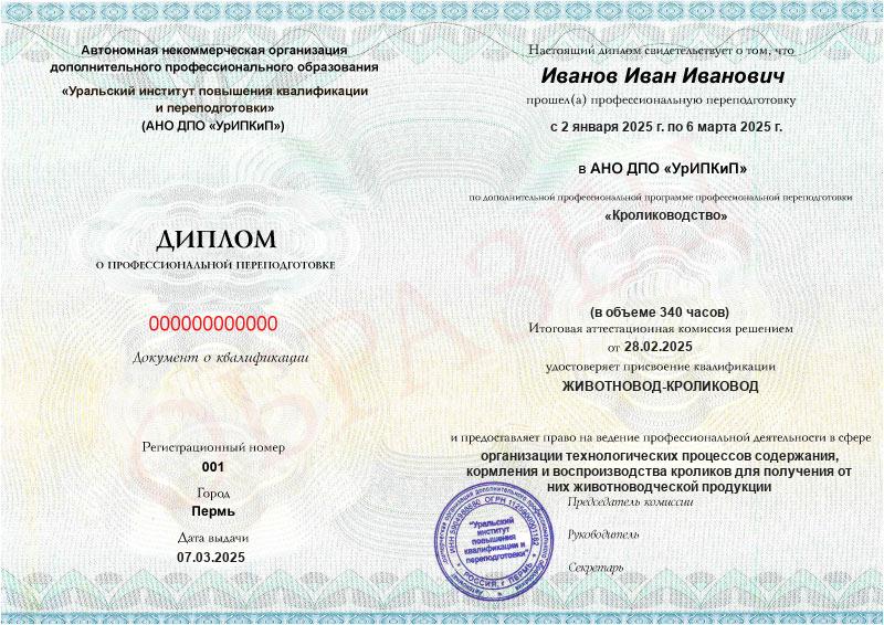 • Диплом о профессиональной переподготовке с присвоением квалификации «Животновод-кроликовод»
