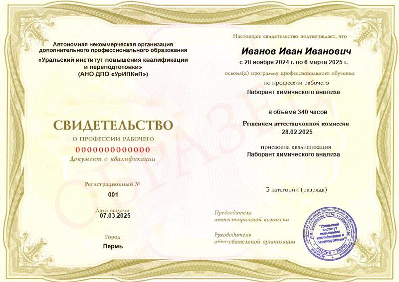 - Свидетельство АНО ДПО «МАСХ» о профессии рабочего с присвоением квалификации «Лаборант химического анализа» — выдается выпускникам со школьным аттестатом
