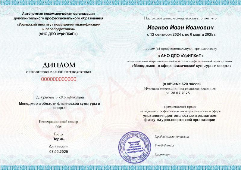 - Образец диплома о профессиональной переподготовке.