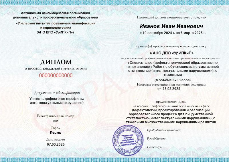 Курс обучения Специальное (дефектологическое) образование по направлению «Работа с обучающимися с умственной отсталостью (интеллектуальными нарушениями), с тяжелыми и множественными нарушениями развития». Олигофренопедагогика и олигофренопсихология (620ч)