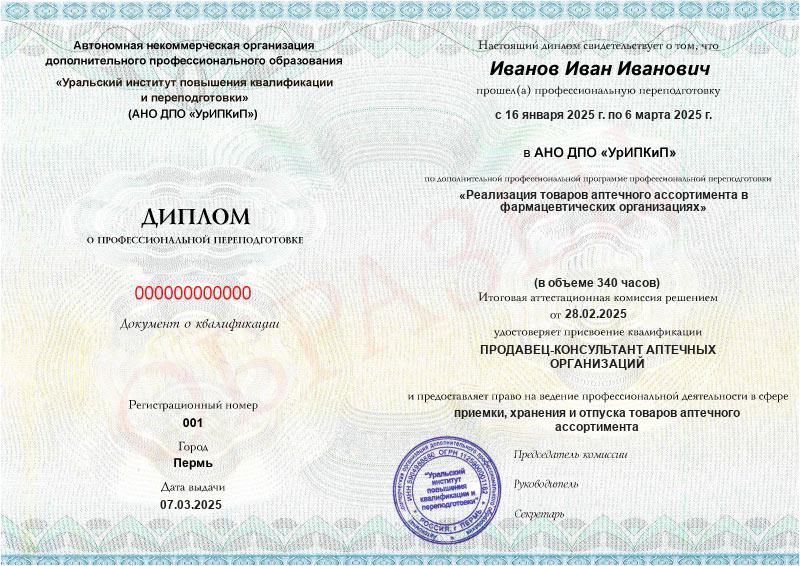 Да, дипломы и удостоверения оформляются в соответствии с действующим законодательством РФ. Документы печатаются на специальных бланках, заверяются печатью АНО ДПО «УрИПКиП».