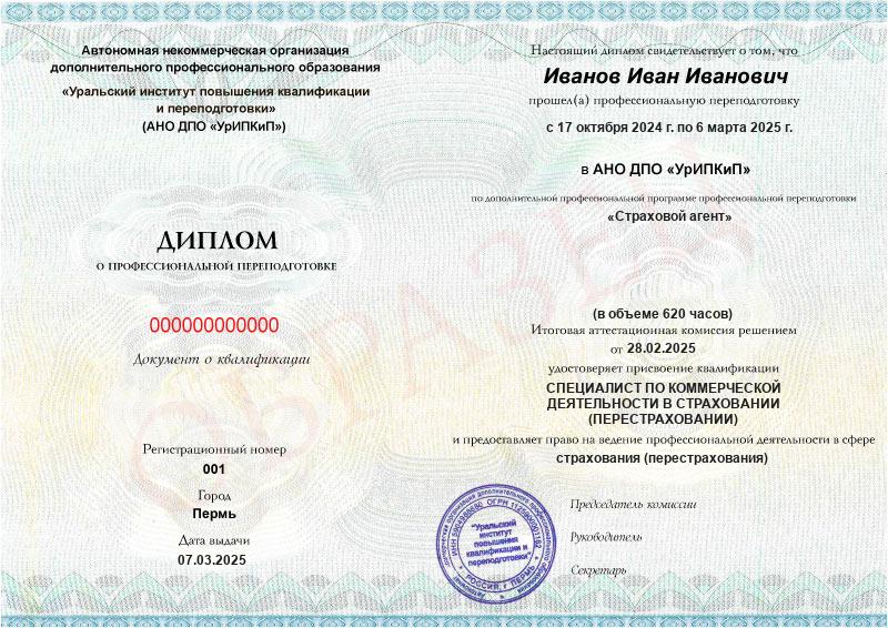 • Квалификация: Специалист по коммерческой деятельности в страховании (перестраховании)